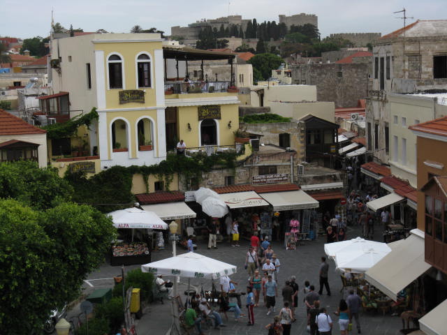 Rhodes City square on a summer night. We enjoyed dinner at just such a location, above street-level on the first floor.